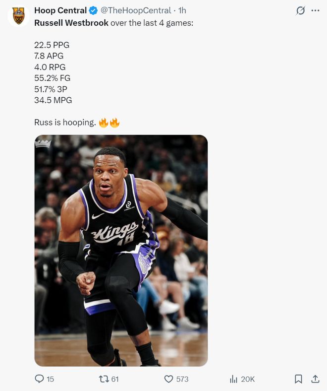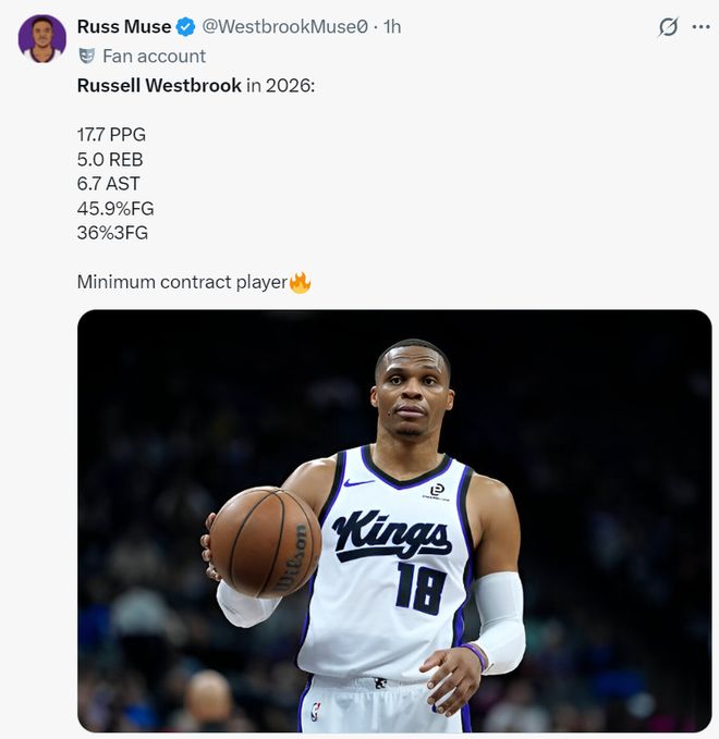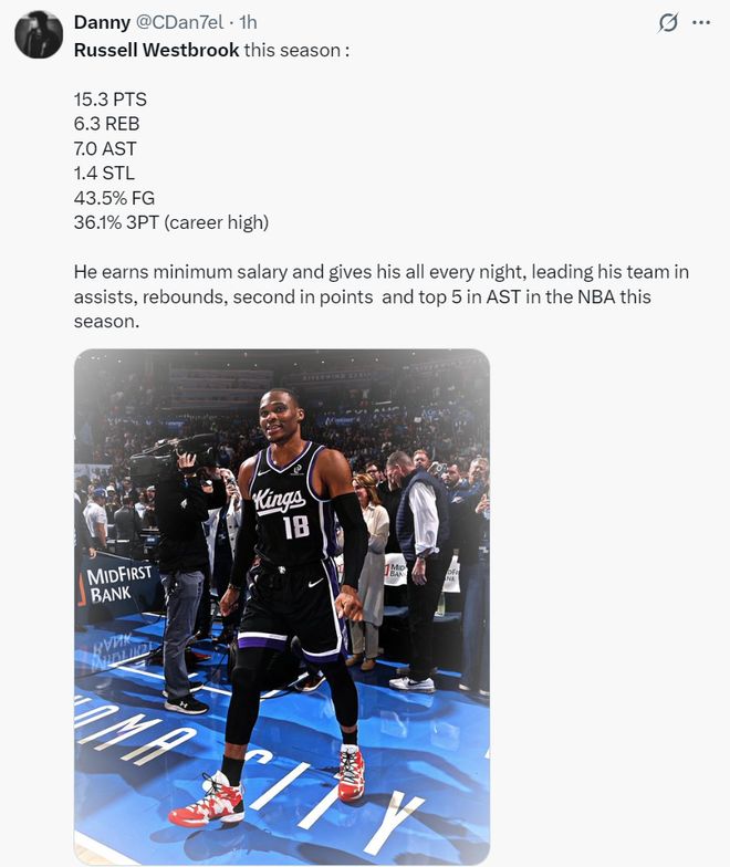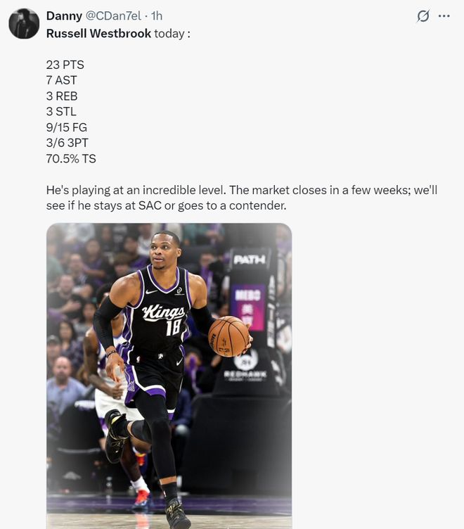 他写道:威少的表现真的太出色了,他拿着最低的工资单每晚都全力以赴,他的助攻、篮板、得分在国王都名列前茅,助攻还是联盟前五的水准,我们应该看看交易截止日进入最后两周,他能不能转投到一些有争冠竞争力的球队。
