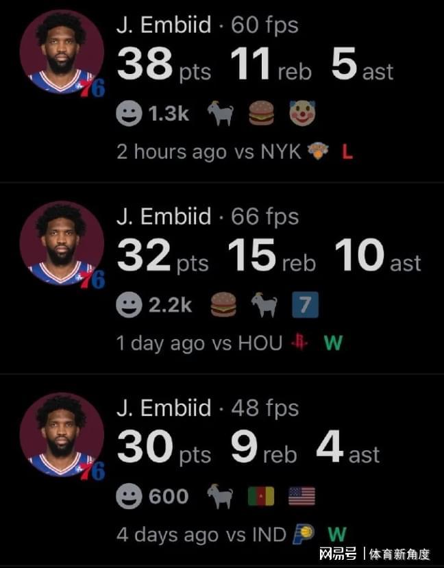 近期,恩比德展现出了势不可挡的竞技状态,已连续四场比赛得分达到 30 分以上,具体得分分别为 33 分、30 分、32 分以及 38 分,其表现仿佛让人看到了他在 2022 - 2023 赛季荣膺 MVP 时的巅峰风采。