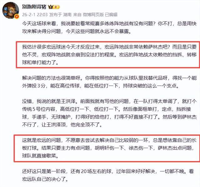 相较于麦穗丰老师的含蓄,另一位广东媒体人别跑刚背猪老师就直接多了,他直言,“我估计很多宏远球迷今天才反应过来,宏远阵地战非常依赖萨林杰吧?而且是只要他不灵,宏观阵地战就会崩到没法打的程度。宏远的阵地战太依赖他的挡拆、转移球和单打能力了。”
