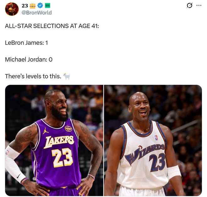 湖人自媒体BronWorld更是晒出41岁詹姆斯入选全明星,与乔丹41岁时已退役的对比数据,配文:“这其中亦有差距”暗示詹姆斯比乔丹更强。