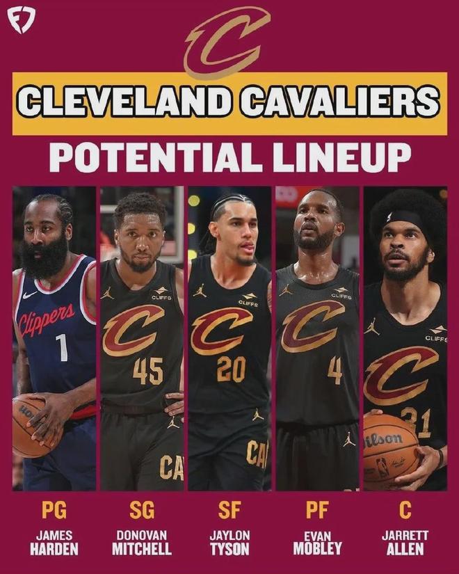美媒预测骑士接下来的首发阵容,乃哈登+米切尔+杰伦-泰森+莫布里+阿伦。