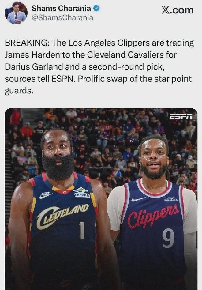 爆料王Shams:快船将36岁的哈登送至骑士,换回26岁的加兰+2026年次轮签。