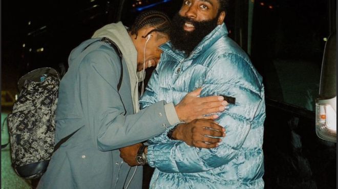 哈登抚摸着阿赞的肩膀,而一向沉默的阿赞,也在哈登的面前开怀大笑。