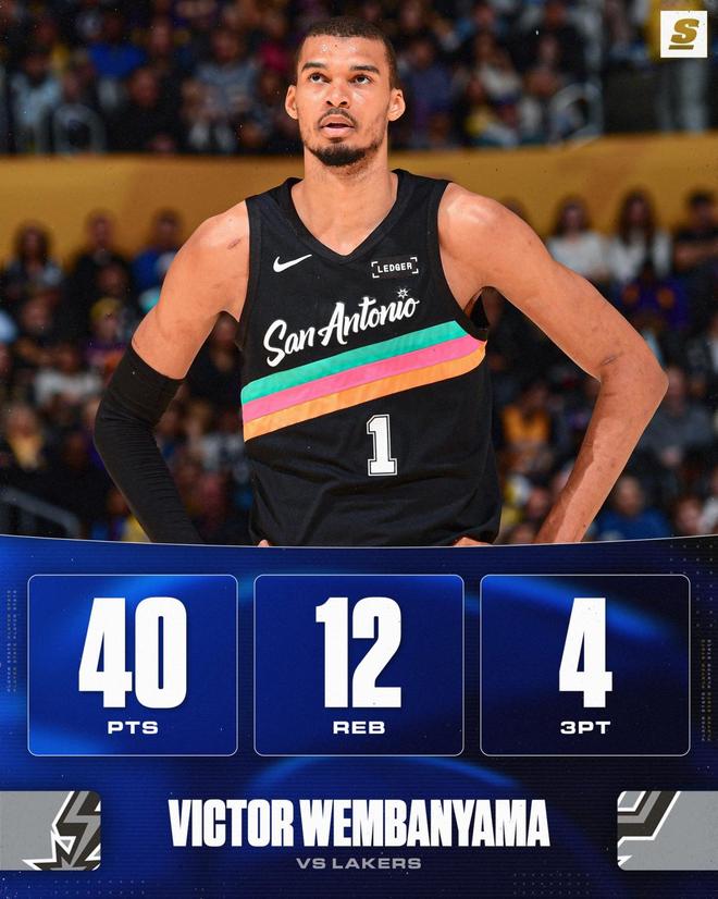 文班亚马40+12+4记3分创NBA历史第1神迹,还刷爆纪录,詹姆斯缺战,马刺完胜湖人!布朗尼12+6!
