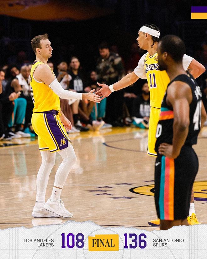 湖人队,肯纳德8中5得到了14分2板5助、蒂米8中5,三分球3中2得到了14分2板、海斯7中6得到13分4板3助、拉拉维亚6中3得到10分2板1助、克内克特8中4得到9分5板1助、巴夫金10中2,三分球5中1得到7分2板1助、八村塁12中3,三分球3中0得到6分4板2助2断、范德比尔特5中2得到6分4板2助、克莱伯6分3板、尼克史密斯6分2板1助、蒂耶罗3分、马农2分1板1助。
