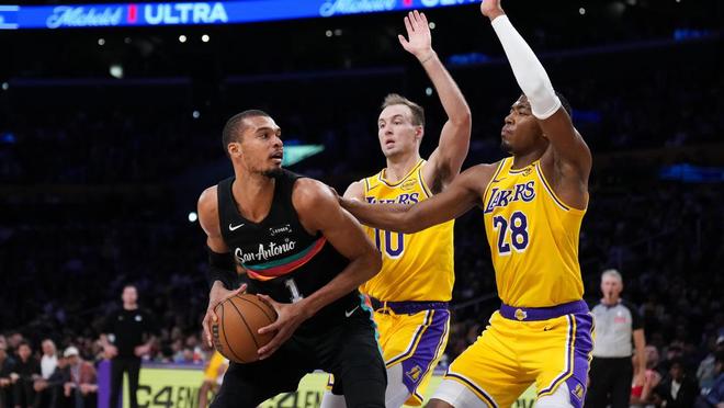 肯纳德中投得分,巴夫金2罚全中为湖人打破僵局,布莱恩特轰进远投,文班亚马跳投取分,马刺打出了23比10的攻势,将分差扩大至30分。布朗尼被封盖,尼克史密斯抛投打进,海斯命中三分球,米奇约翰逊请求暂停。卡斯尔封盖八村塁的扣篮,肯纳德补篮得分,湖人连追7分,马刺再次请求暂停。卡斯尔因伤下场,文班亚马暴扣,八村塁单打连续不中。布莱恩特与克莱伯对射三分球,布莱恩特被布朗尼犯规,前者2罚1中。