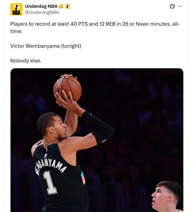 文班亚马40+12创历史第1神迹还刷爆纪录,詹皇缺战,马刺完胜湖人