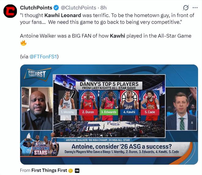 前NBA球员安托万-沃克谈到了小卡的表现:我觉得卡哇伊在全明星的表现非常好,在家乡父老面前为球迷贡献一场精彩的表演,我们需要全明星重新变得具有竞争性。