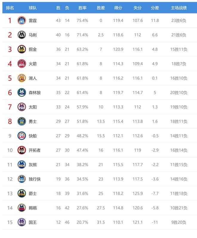 今日比赛后西部排名没有变化,只是胜场差有所改变。