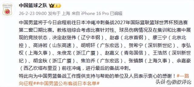 北京时间2月23日,根据中国篮协官方的公示,中国男篮将于今日启程前往日本冲绳冲刺备战2027年国际篮联篮球世界杯预选赛第二窗口期比赛。教练组综合考虑比赛针对性、球员伤病情况及在集训和比赛中展现的竞技状态。
