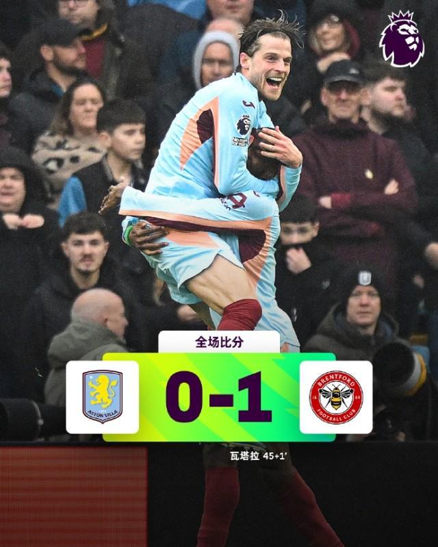 英超24轮,阿斯顿维拉主场0比1不敌布伦特福德。第42分钟,沙德报复犯规,踩踏卡什要害部位被红牌罚下场,布伦特福德10人作战。 3分钟后,瓦塔拉禁区内拿球,小角度爆射破门。下半场维拉狂射20脚(上半场7射)无功而返,“小蜜蜂”输人不输球。维拉输球后落后榜首阿森纳7分,领先身后曼联5分。